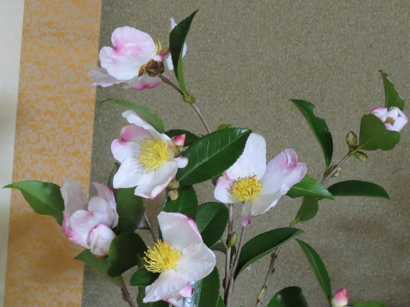山茶花の生け花 山茶花だと思わず、榊だと思って買った花枝が、半月後に花をつけました。 榊にしては大きめの硬い実がついていたので、不思議に思ったのですが・・・・・。今はいろんな品種もあるから。 一重で淡いピンクの色をしていました。二回目の水替えの時に榊ではないことに気づきました。 暖房はつけていない部屋でしたが、隣の部屋は朝7時ごろから夜中12時ごろまで炬燵と暖房がついています。 欄間から隣の部屋にも幾分暖気が行きます。 せっかく買ったので、今回はこの榊で我慢してもらいました。おかげで綺麗な花が見られました。 |