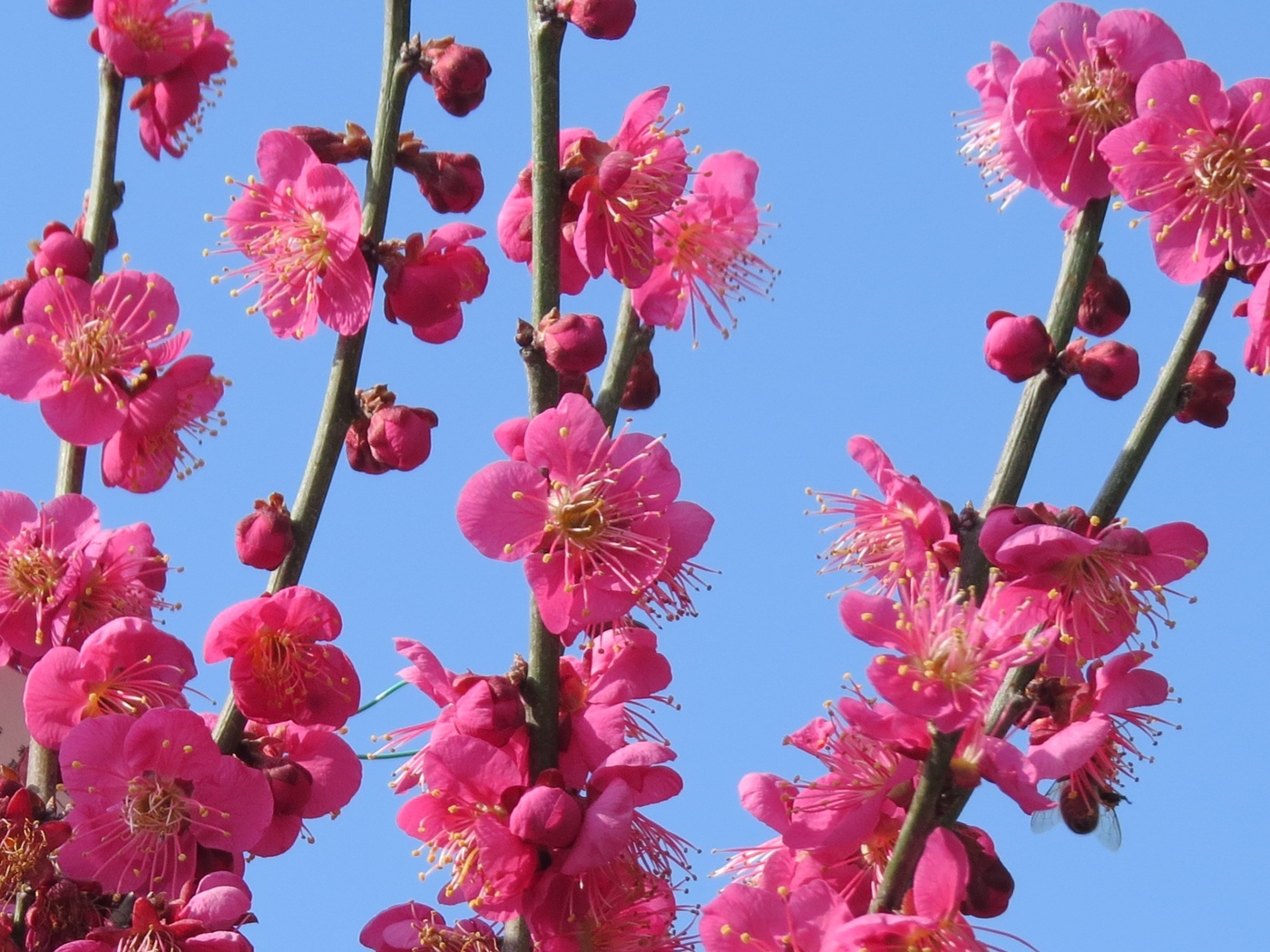 | 紅梅 今年は去年より早く、一月と二月初旬に雪が降った。そのせいか梅の花はまだつぼみが固い。 花屋で鉢植えの梅が売られていた。紅梅もあった。綺麗な色をしていた。 シベをぴんと伸ばして生き生きとしていた。 |
