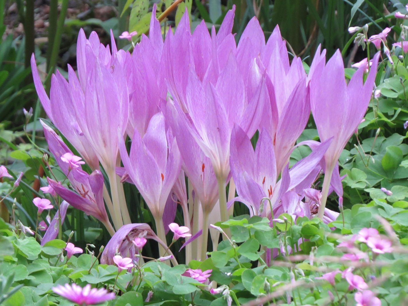 彼岸花の時期に咲くイヌサフラン(別名コルチカム)です。 葉が出ないうちににょきっと花が先に咲きます。