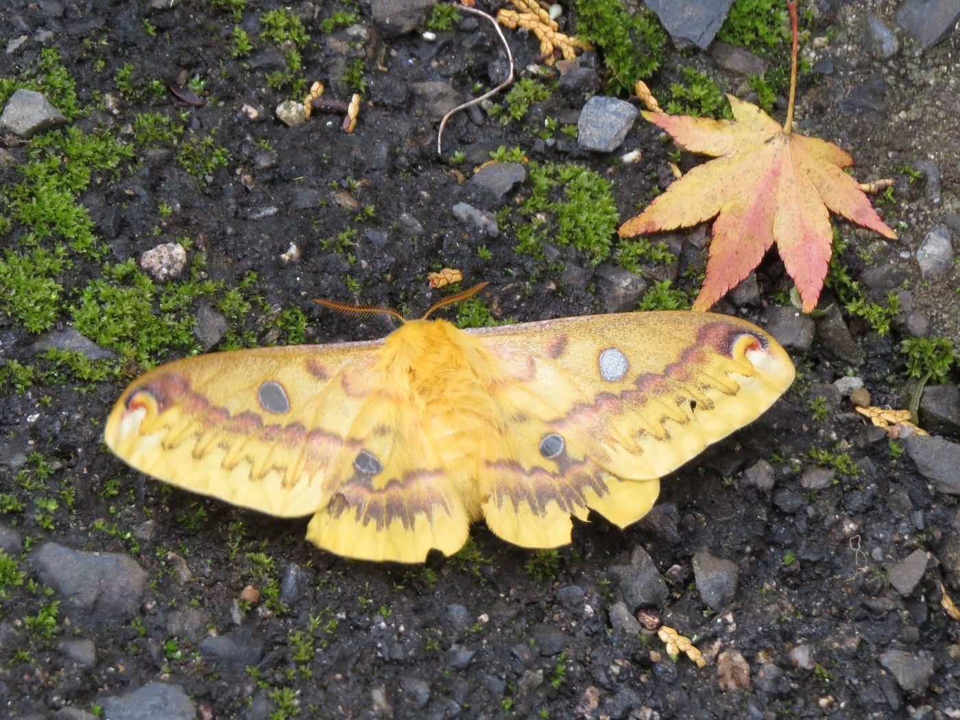 蛾のクスサン 銀杏の葉が舞い落ちて来たかとよく見ると、上下にパタパタと動いている。黄色の蝶のようでもある。 とりあえず写真に撮って、家の中に入り名前を調べる。黄色の蝶で検索しても出てこない。蛾かな? 蛾で検索すると出てきた。同じような模様で、同じような黄色だが、画像によって濃淡がある。 でも、ほぼこれに間違いはない。ヤママユガ科のクスサンだと分かった。 今年9月初めに北海道の北見市で大量発生した蛾だそうだ。毒はない。 初めて見る蛾だった。一週間の命だという。この蛾は弱っているのかしばらく地面から離れない。 翌朝見るともう居なかった。 |