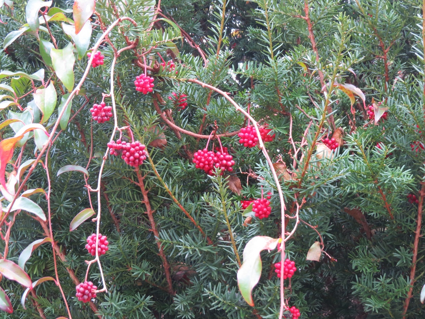 イチイの木に赤い実が絡まっています。まるでクリスマスツリーの雰囲気です。